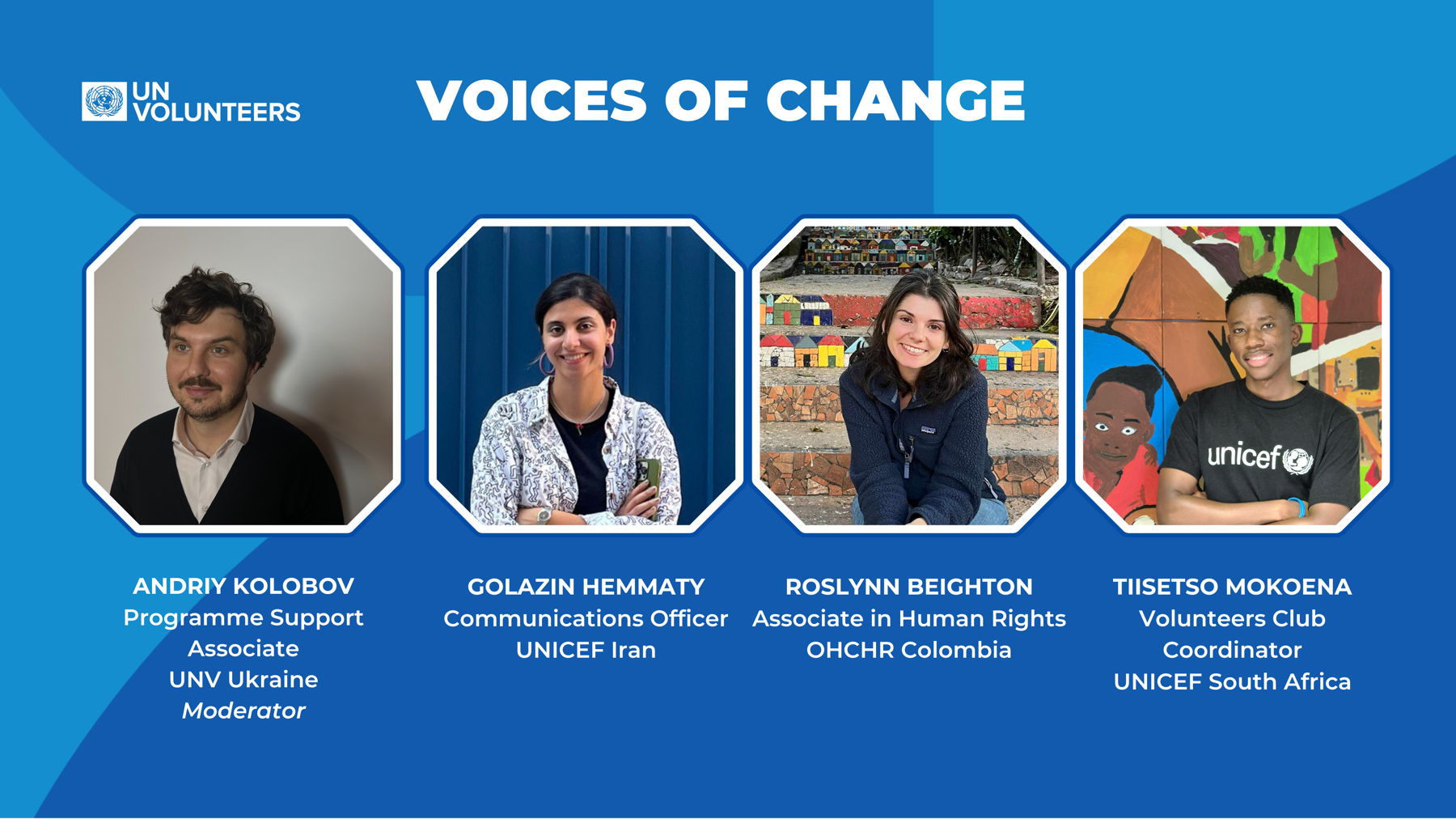 Voices of Change webinarA monthly interactive webinar series for UN Volunteers to connect globally, exchange experiences, raise awareness about SDG contributions, and drive change through inter-agency knowledge sharing. Date:Thursday, 27 February Time: 2:00 PM - 3:00 PM Meet our panelists: |